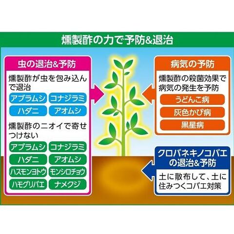 オリジナルブレンドの燻製酢が害虫を包みこんで退治し、病気を殺菌して発生を防ぎます。