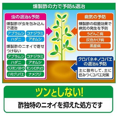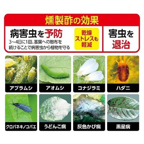 オリジナルブレンドの燻製酢が害虫を包みこんで退治し、病気を殺菌して発生を防ぎます。