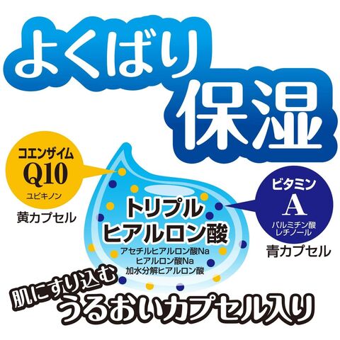 ◆トリプルヒアルロン酸(アセチルヒアルロン酸、ヒアルロン酸Na、加水分解ヒアルロン酸)と溶ける「うるおいカプセル」コエンザイムQ10(ユビキノン)、ビタミンA(バルミチン酸レチノール)を配合。保湿力を高めました。