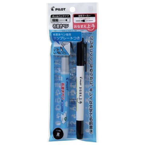 ◆どんな素材にもにじみにくく、書き心地もなめらかな布書き用ボールペンと名前ペンにひらがなテンプレートがセットになったおなまえペンセット
