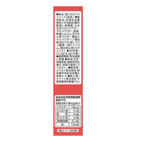 乳等を主要原料とする食品(国内製造)、クリーミングパウダー、脱脂粉乳、乾燥鮭、たまねぎエキスパウダー、チキンパウダー、食塩、乾燥にんじん、ほうれん草パウダー、酵母エキス/増粘剤(加工でん粉)、クエン酸第一鉄ナトリウム、酸化防止剤( ビタミンE、ビタミンC)