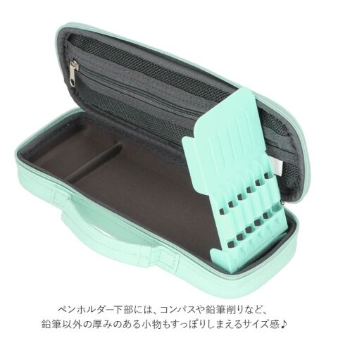 ペンホルダー下部には、コンパスや鉛筆削りなど、鉛筆以外の厚みのある小物もすっぽりしまえるサイズ感! 消しゴム専用のくぼみもあるので、小物が散らからずケースの中はいつもスッキリ!