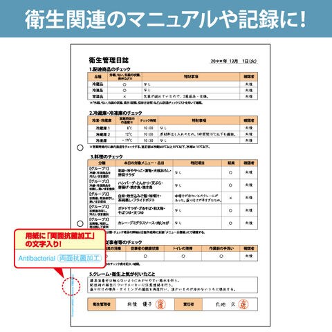 ◆用紙に「Antibacterial 両面抗菌加工」と印刷されているので使う人に抗菌効果があることが伝わります。