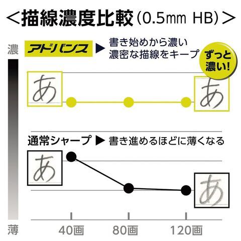 偏減りしやすい文字にも効果大!  画数の少ない1画の線が長い文字でもキレイに均一な線が書けます。また2Bなどの濃く書ける柔らかいシャープ替芯を使用しても、細く一定の線幅が続きます。