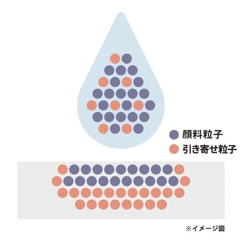 インクの広がりやにじみを抑える「引き寄せ粒子」。インク同士を引き寄せることで描線のにじみや裏うつりを抑えます。