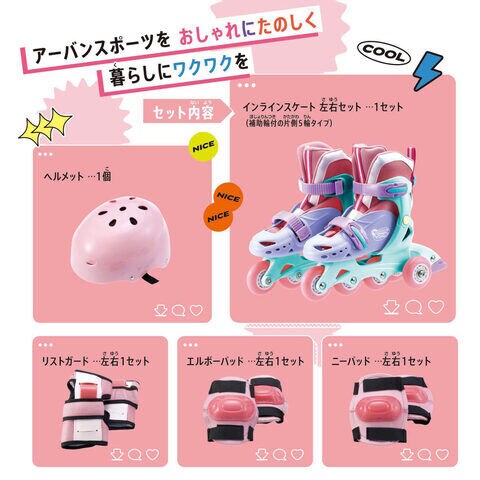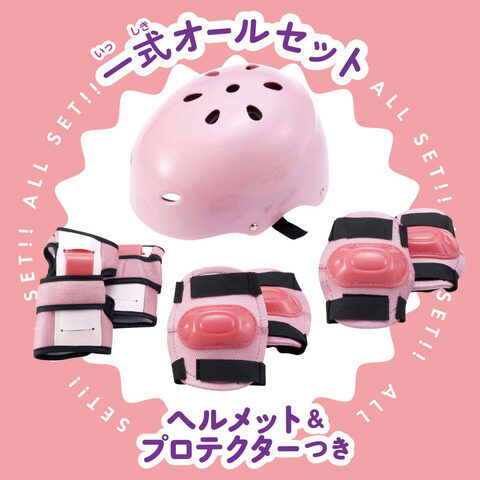 補助輪やヘルメット、プロテクターが付属した、スケートがはじめてのお子さまのためのオールインワンセットです。