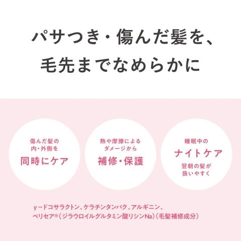 ■全成分:水、ラウリン酸イソアミル、エチルヘキサン酸セチル、ラウリン酸メチルへプチル、イソペンチルジオール、(C14-22)アルコール、γ-ドコサラクトン、加水分解ケラチン(カシミヤヤギ)、アルギニン、ジラウロイルグルタミン酸リシンNa、セラミドNG、セラミドNP、セラミドAP、トリ(カプリル酸/カプリン酸)グリセリル、グリコシルトレハロース、ヒドロキシステアリン酸エチルヘキシル、ポリアクリレート-13、加水分解水添デンプン、(C12-20)アルキルグルコシド、ポリイソブテン、ポリソルベート20、BG、水添レシチン、フィトステロールズ、トコフェロール、12-ヘキサンジオール、エチルヘキシルグリセリン、フェノキシエタノール、香料(天然香料)