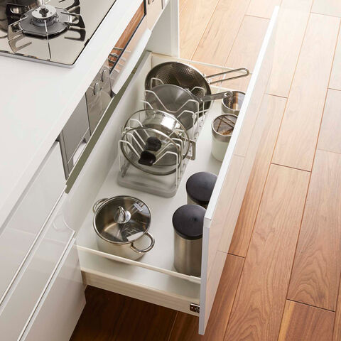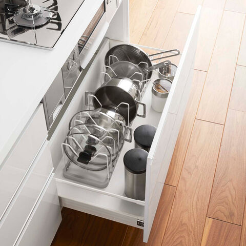 ◆鍋やフライパンのサイズに合わせて仕切りパーツの位置は3cmごとに調整可能。