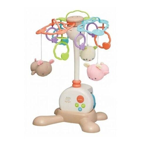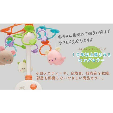 赤ちゃん目線でまわるかわいい動物たち、オルゴール音のメロディや自然胎内音を収録した、やさしいカラーの癒しのメリーです。