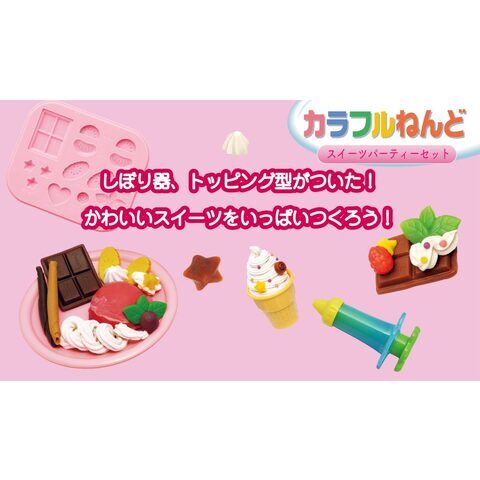 ねんどでスイーツがいっぱいつくれるセット! ねんど型やしぼり器を使って、簡単に本物そっくりなスイーツが作れます。