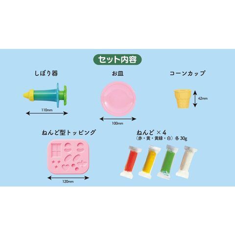 • 材質 : こむぎねんど:小麦、塩分、水/型・コーンカップ・しぼり器:ポリプロピレン、ABS樹脂