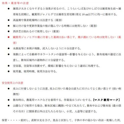 ◆雑草の生える前から生え始めに散布してください。雑草が大きくなりすぎると効果が出にくくなります。