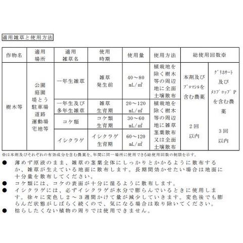 - 農薬の種類:グリホサートイソプロピルアミン塩、ブロマシル、メコプロップPカリウム塩液剤