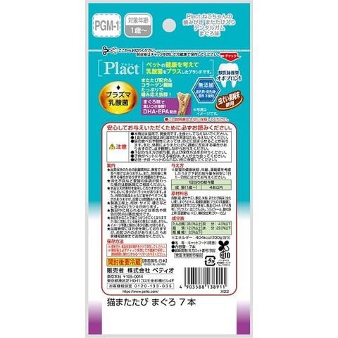 ■原材料:肉類(鶏・鶏ササミ)、豚皮、米粉、またたび純末(虫えい果)、まぐろエキス、殺菌乳酸菌(プラズマ乳酸菌)、卵黄粉末(オボプロン含有)、魚油(DHA・EPA含有)、グリセリン、加工でんぷん、ソルビトール、酸化防止剤(亜硫酸Na・V.E)、増粘安定剤(グァーガム)