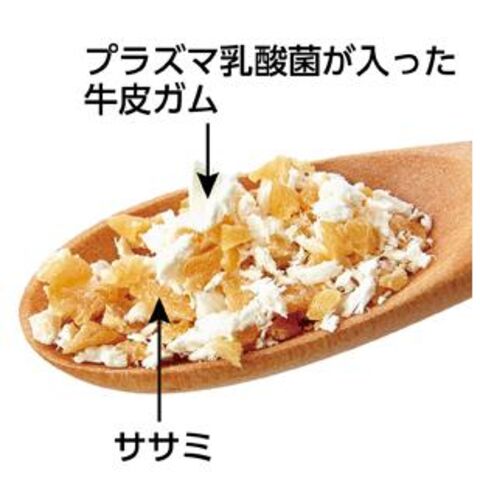 牛皮、肉類(鶏ササミ・鶏レバー)、米粉、でんぷん類、魚介類、チキンエキス、植物性油脂、酵母エキス、食塩、殺菌乳酸菌(プラズマ乳酸菌)、魚油(DHA・EPA含有)、卵黄粉末(オボプロン含有)、脱脂粉乳、加工でんぷん、グリセリン、リン酸塩(K・Na)、増粘安定剤(グァーガム)、酸化防止剤(亜硫酸Na・V.E)