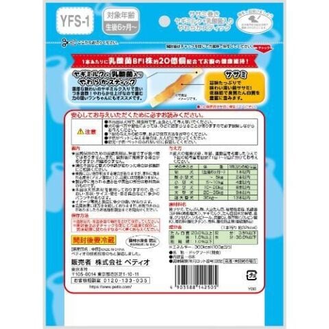 ■原材料:鶏ササミ、でんぷん類、大豆たん白、植物性油脂、乳酸菌(BFI株(熱処理済))、ヤギミルク、たん白加水分解物、食塩、グリセリン、ソルビトール、炭酸Ca、保存料(ソルビン酸K)、着色料(酸化チタン)、香料、酸化防止剤(亜硫酸Na)