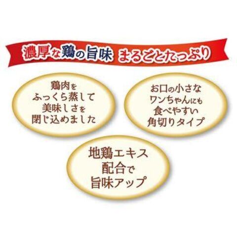 肉類(鶏・鶏レバー)、小麦粉、パン粉、でんぷん類、食塩、地鶏エキス、にんじん、ほうれん草、加工でんぷん、グリセリン、膨張剤、プロピレングリコール、リン酸塩(Na)、カゼインNa、炭酸Ca、着色料(酸化チタン・β-カロテン・黄4号・黄5号・銅葉緑素・赤106号)