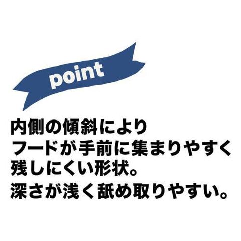 ◆内側の傾斜により、フードが手前に集まりやすく残しにくい形状。深さが浅く舐め取りやすい。(※特許出願中)