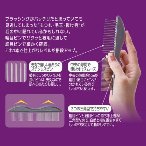 ◆粗目ピンでサクッと被毛に通して細目ピンで細かく確認。