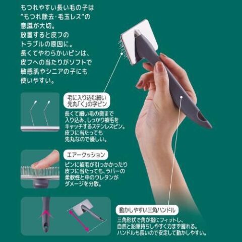 ◆長くてやわらかいピンは、皮フへの当たりがソフトで敏感肌やシニアの子にも使いやすい。