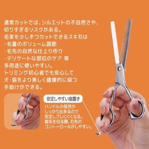 ◆毛束を少しずつカットできるスキ刃は「・毛量のボリューム調節・毛先の自然な仕上り作り・デリケートな部位のケア 」等多用途に使いやすい。