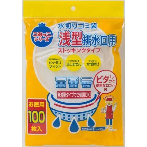 ◆キッチンの浅型排水口用水切りゴミ袋。ストッキングタイプでセットがしやすい。小さなゴミもしっかりキャッチ。