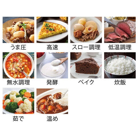 10役:うま圧、高速、スロー、低温、無水、発酵、ベイク、炊飯、茹で、温め