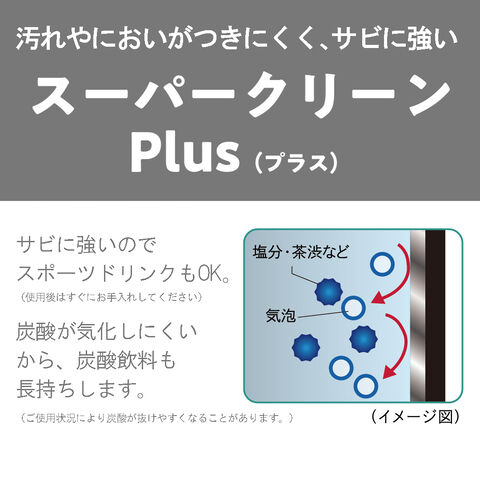 スーパークリーンPlus(プラス)加工によりボトル内面の凹凸が少ないので、炭酸の気化を抑え、汚れ・においもつきにくくなっています。