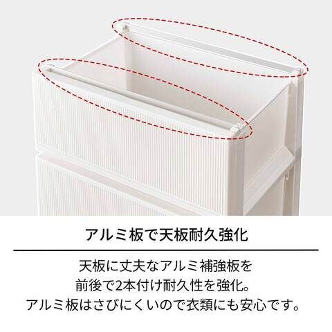 天板に丈夫なアルミ補強版を前後で2本付けることで、耐久性を強化。アルミ板はさびにくいので衣類にも安心です。