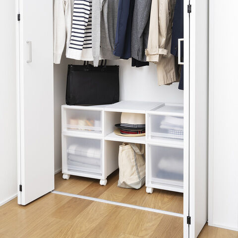 賢く収納したいあなたに、理想の収納ケースを。全9タイプの豊富なサイズ展開で、収納する物や設置場所にぴったりフィット。たわみに強く、積み重ねても安定感抜群。前倒れ防止機能や滑りにくいゴム脚付きで使いやすさも追求。さらに、キャスター対応で移動もラクラク。シンプルなデザインと「すりガラス調」の高級感が、お部屋に美しく馴染みます。