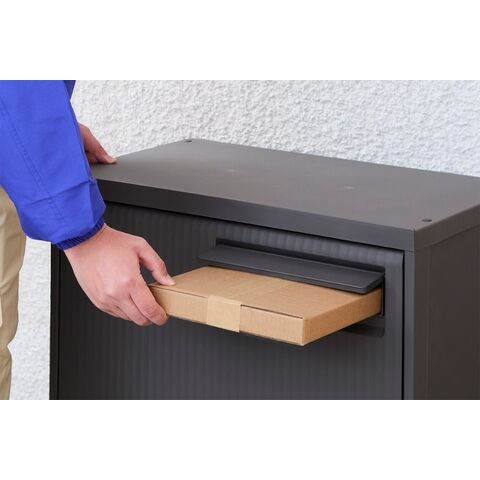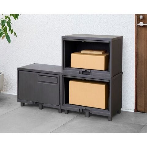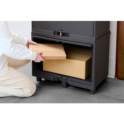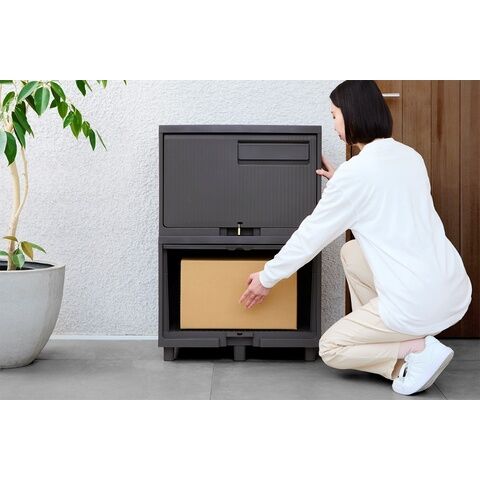 忙しい日常の中で、宅配便の受け取りをもっと便利に、もっと安心に。3段まで積み重ねることができてその状態でもスムーズに受け取りができます。フリマアプリなどで活発化する小型荷物の投函扉付きで便利。奥行37cmとスリムなのに大型荷物の受け取りもできます。扉は本体にしまうタイプなので雨水が入りにくい構造です。鍵穴、ワイヤー穴付きで防犯面も安心! 配送業者向けの案内ステッカー付きです。