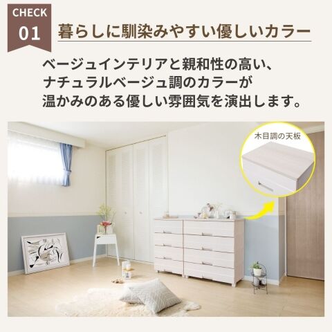 ナチュラルベージュ調のカラーで温かみのある「暮らしにやさしい」チェスト。