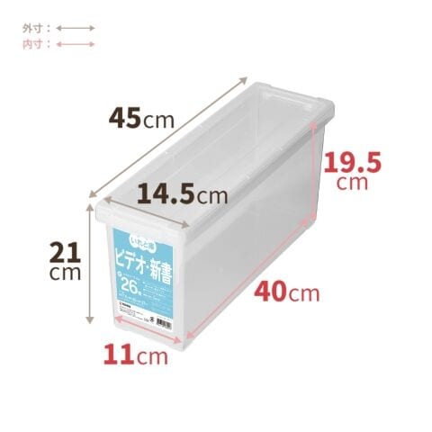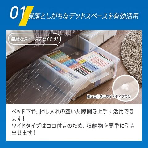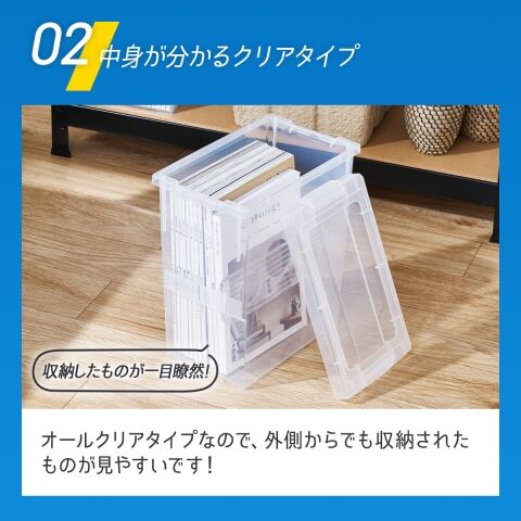 フタをしていても中身が見えるオールクリアタイプなので、収納されているものが一目で確認できます。ケースに収納したままでも側面から背表紙が見えるので、積み重ねていても探しやすいです。