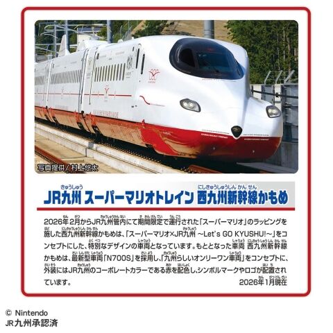2025年11月からJR九州管内にて期間限定で行われる「スーパーマリオ×JR九州 ~Let’s GO KYUSHU! ~」キャンペーンにてスーパーマリオの特別デザインが施された西九州新幹線かもめが、実車と同じ6両編成にプラキッズが1体付属してプラレールに登場です。