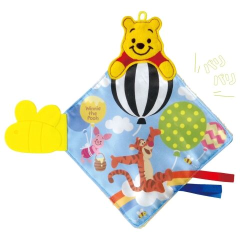 かわいいハチの歯固めが付いた、くまのプーさんのパリパリ入り布おもちゃです。