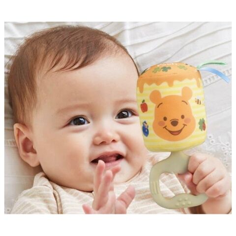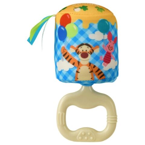 布製のやわらか素材なので、赤ちゃんに渡しても安心 歯固めにもなる、3種類の凸凹付きの取っ手 振るとポロロンとやさしい音が鳴る 指先遊びができるタグ付き 裏側はピグレットとティガーのかわいいデザイン