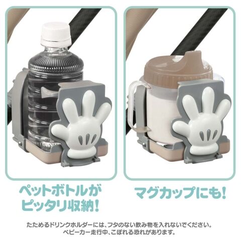 ベビーカーに取り付けられる、ミッキーのたためるドリンクホルダーです。