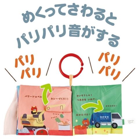 トミカとトムの仲間たちが「いないいないばあ」をしてくれる、お出かけに便利なリング付きのパリパリ入り布絵本です。
