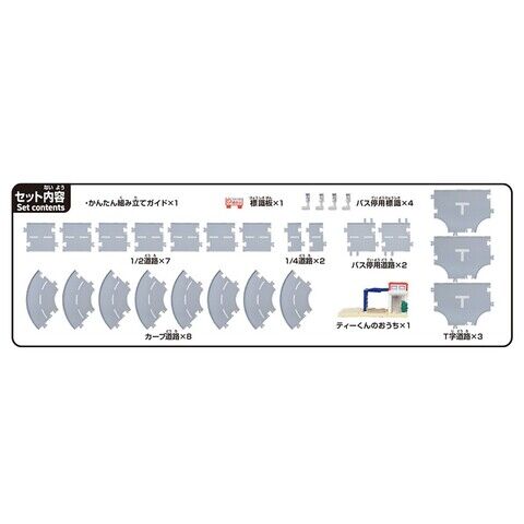 1/2道路×7 1/4道路×2 カーブ道路×8 T字道路×3 バス停用道路×2 バス停用標識×4 ティーくんのおうち×1 標識板×1 取扱説明書(かんたん組み立てガイド)×1