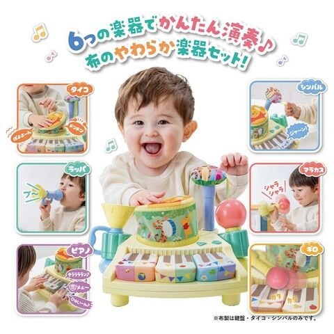 6つの楽器でかんたん演奏ができる、くまのプーさんの、布のやわらか楽器セットです。