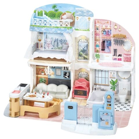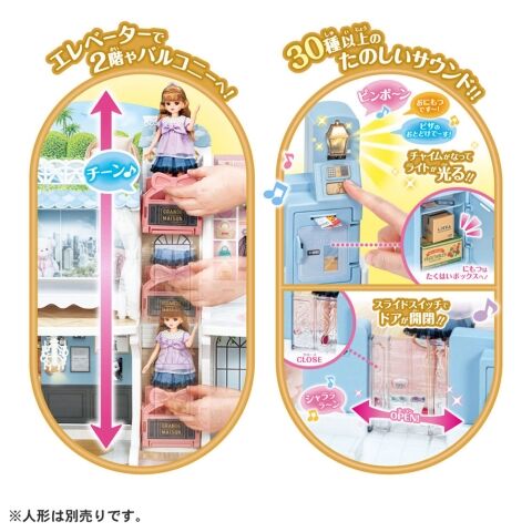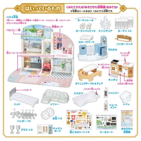 1階床パーツ×2 2階床パーツ×2 壁パーツ×8 すべり台付きバルコニー バルコニー柵 エレベーター エレベーター床 柱支えパーツ×2 げんかん スロープパーツ キッチン(食洗器、シンク蛇口含む) ダイニングテーブル&チェア ソファー ベッド(ヘッドボード含む) バスタブ(蛇口含む) トイレ カーテンレール カーテンフック×2 カーテン×2 ハンガーフック ハンガー×5 お皿×2 グラス×2 シャンプー トリートメント シャンデリア 背景ボード固定パーツ×24 背景ボード×2 1階床シート×2 2階床シート×2 キッチンボード 紙こものシート×3 シールシート あそびかた説明書