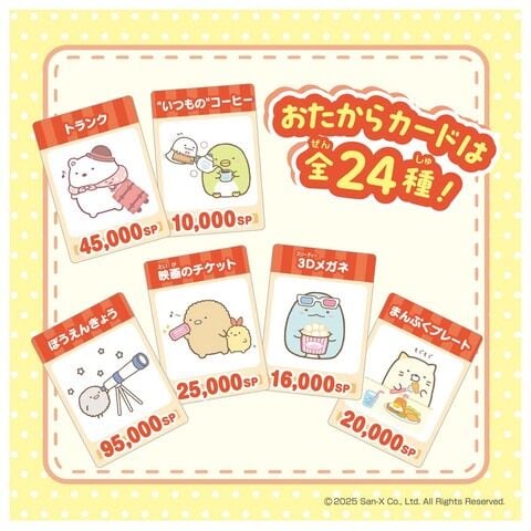 ルーレット付きゲーム盤 キャラクターコマ台紙×5 コマ用台座×5 キャラクターカード×5 みにっコカード×5 おたからカード×25 すみっこポイント(SP) 1セット すみっこポイント立てトレー すみっこポイント立て用シート×3 遊び方説明書