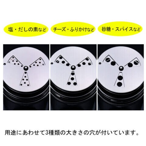 ◆スパイスや粉チーズ・塩・砂糖等入れるものに合わせて調節できる3種類(大・中・小)の穴が付いています。