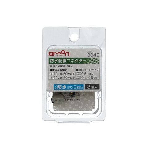 エーモン工業 防水配線コネクター 適合コードサイズ:(電源側)AV(S)0.6~1sq (分岐側)AV(S)0.1~0.5sq(防水IPX3相当)(入数:3個) amon 3349 【返品種別A】