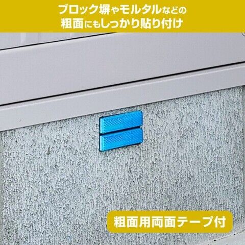 夜間の視認性に優れた反射材を採用曲面にも対応し、ブロック塀やモルタルにもしっかり取り付けできる粗面用両面テープ付き正面反射。