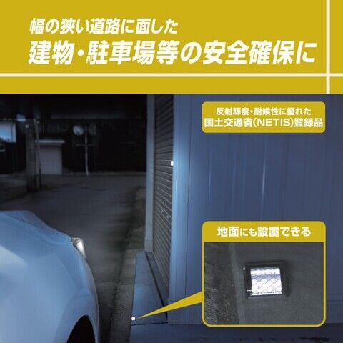 夜間の安全対策に反射輝度・耐候性に優れた国土交通省(NETIS)登録品の反射材を使用地面にも設置できる再帰性反射高輝度。
