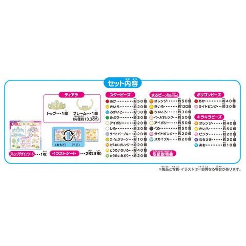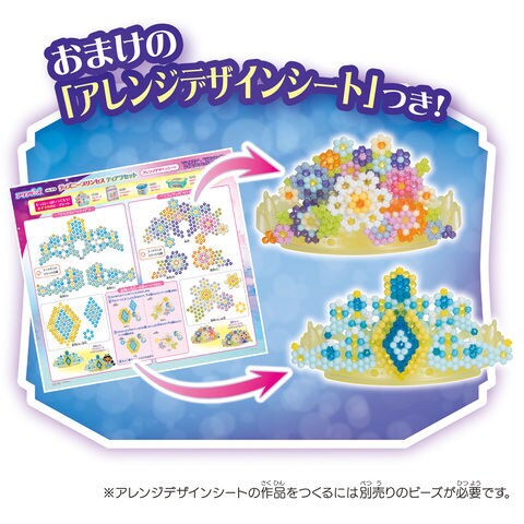 別売りのビーズでジャスミンやラプンツェルのティアラが作れるアレンジデザインシート入り。