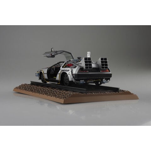 大ヒットSF映画『バック・トゥ・ザ・フューチャー Part 』で、1885年から1985年に戻るためにタイムスリップの条件である約142km/hを出すため、線路の上を走れるよう足回りが改造されたタイムマシンを1/24スケールのプラモデルで再現。