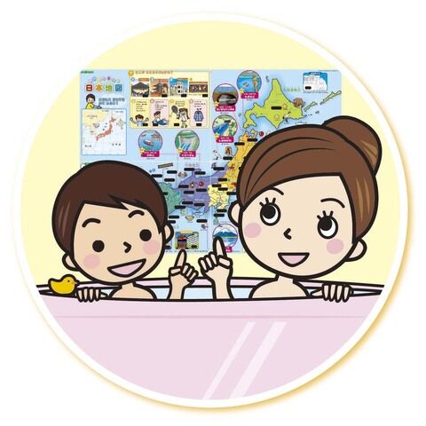おふろの壁に水をつけて地図を貼ったり、湯船に浮かべたりして、地図を見ながらお互いにクイズを出し合って当てっこして遊びましょう。