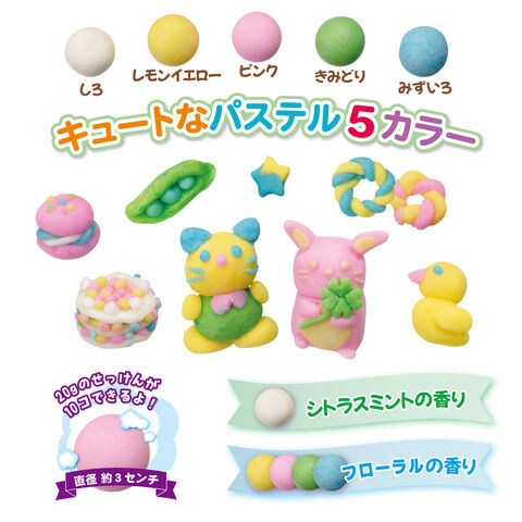 おうちで楽しく「ねんどせっけん」が作れるキット! キュートなパステルカラーのセットです。
